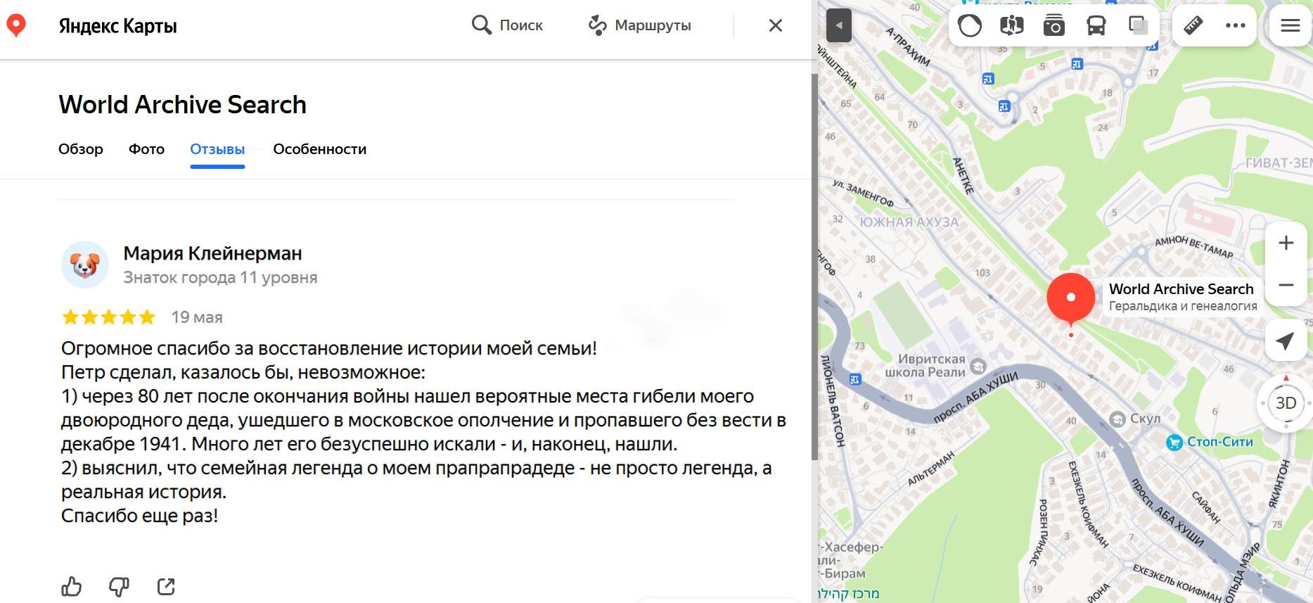 Огромное спасибо за восстановление истории моей семьи! Петр сделал, казалось бы, невозможное: 1) через 80 лет после окончания войны нашел вероятные места гибели моего двоюродного деда, ушедшего в московское ополчение и пропавшего без вести в декабре 1941. Много лет его безуспешно искали - и, наконец, нашли. 2) выяснил, что семейная легенда о моем прапрапрадеде - не просто легенда, а реальная история. Спасибо еще раз!
